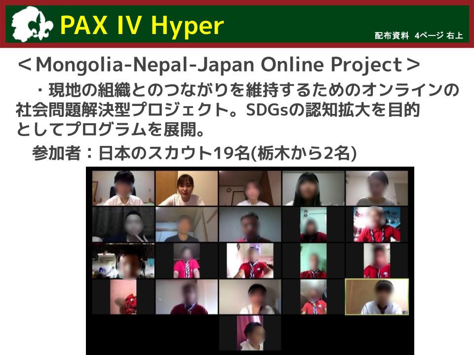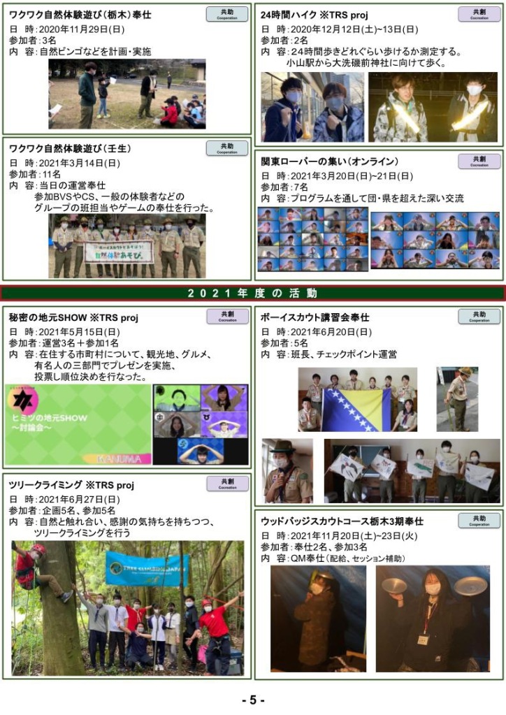 また、年代や立場を超えた交流を通して相互理解を深め、日頃の指導や活動を振り返ることで、今後のより良いスカウト活動につなげることを目的としています。