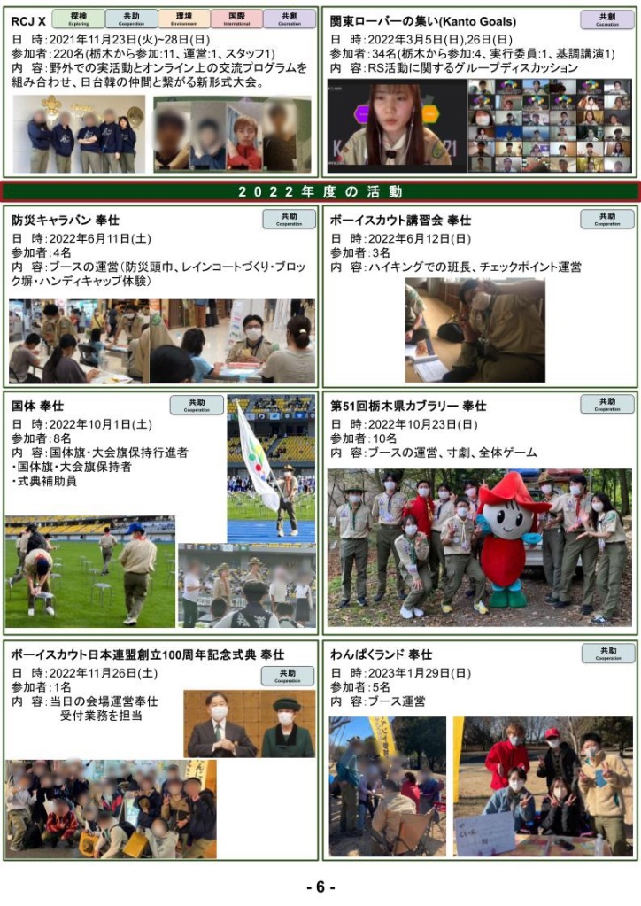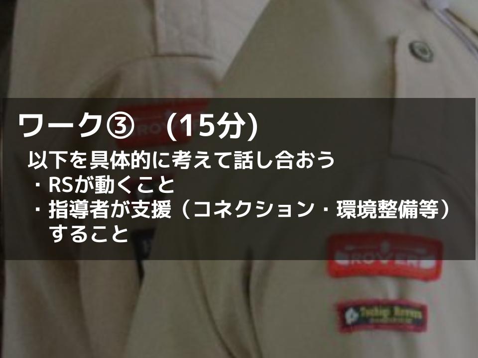 | 目的 | RS部門を十分に知らない指導者に対し、RSができることや多様な支援の在り方を知ってもらい、その学びを自分の団のRSやVSにも伝えてもらう |