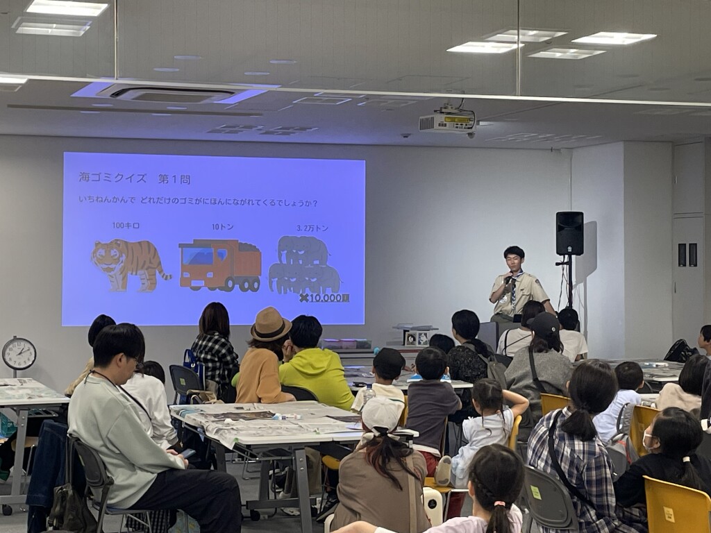 ステージ発表では、約20席あったのがすべて埋まり、立ち見をしてくださる方もいるほどでした。代表の3名が、約20分間をかけ、ボーイスカウトや海ごみアート教育プロジェクトについて説明を行いました。私自身も発表に参加したのですが、とても緊張しながらもメンバーたちの応援の言葉や代表していることの誇りをもって登壇しました。原稿も資料も用意はしてありましたが、その時々で聴衆の皆さんの表情も確認しながら丁寧に話すことを心がけました。終わってから反応を聞いてみると、自分たちの伝えたかった内容が伝わっていたようで、とても安心しました。