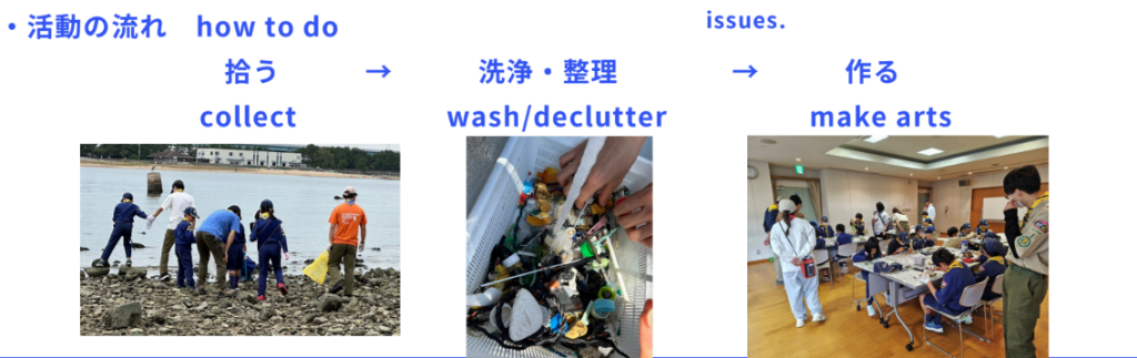 普段の活動内容としては、「海ごみを拾う」「海ごみをアートにする」という2つのフェーズのワークショップを行っています。そして、ワークショップ参加者からのフィードバックや我々スカウト側の自己評価をもとにワークショップの開催方法についての反省・改善をします。そして、最終的により最適なものが教育プログラムとして定式化される予定です。もちろん、実際にワークショップを行うことで、環境奉仕活動に具体的に貢献するという意味もあります。